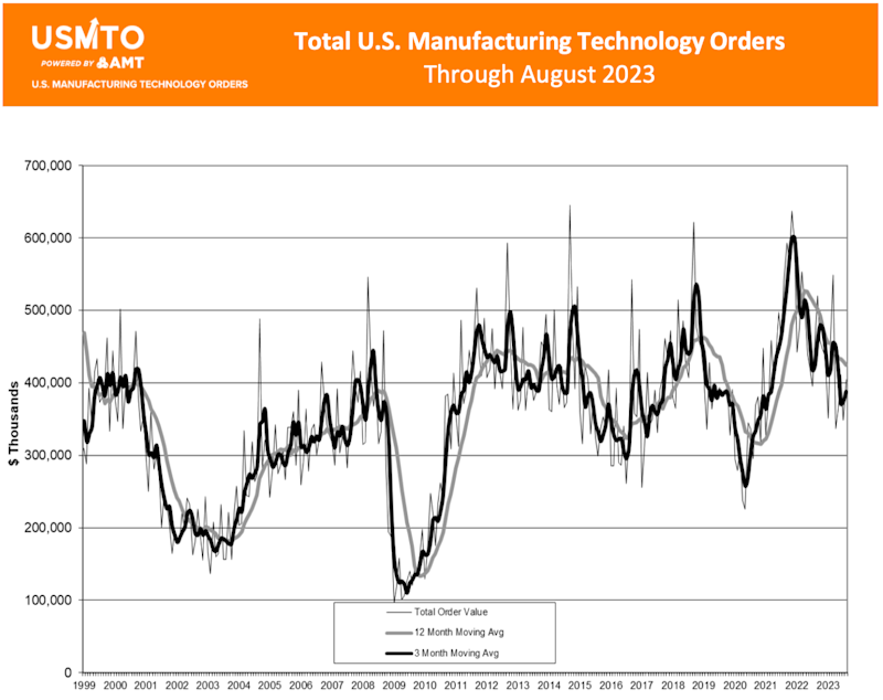New orders of manufacturing technology totaled $404.2 million in August 2023, according to the latest U.S. Manufacturing Technology Orders Report published by AMT – The Association For Manufacturing Technology. August orders increased 16.1% from July 2023 but were down 12.2% from August 2022. Year-to-date orders reached $2.23 billion, 12.6% lower than the first eight months of 2022.