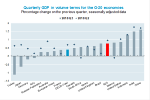 Growth of real gross domestic product (GDP) in the G20 area eased to 0.8% in the third quarter of 2018, compared with 1.0% in