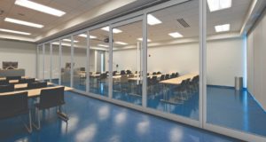 The Hufcor GF Series Acoustical GlassWall is an attractive low profile framed operable GlassWall for interior applications featuring no floor tracks, clean