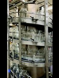 Multi-Conveyor recently built a stainless steel constructed overhead plastic chain conveyor that feeds a decline rotary drum spiral conveyor for