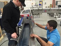 Multi-Conveyor recently built this stainless steel table top system designed to rotate bag-in-box cartons from wide edge to narrow edge