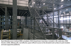 RMI-Compliant, OSHA-based stairs, included in IBC code since 2009, enable safe, cost effective, space efficient pick module and rack-supported platform warehouse access