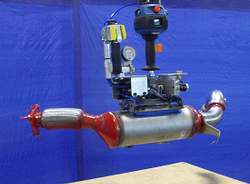 A Cynergy Ergonomics vacuum lifter recently installed in a major automotive manufacturer lifts and repositions exhaust assemblies in and out
