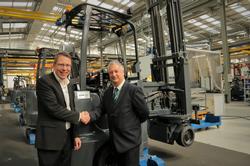 Eddie Stobart Materials Handling Equipment Manager Brian Smith, together with John Myers, Operations Manager Dagenham Depot, visited Combilift’s new 46,500m² production facility to see the 100th truck roll off the production line. Brian Smith commented: “We have been impressed with the performance of the Aisle Masters to increase productivity in our warehouses over the years, and equally impressed with the accommodating and can-do attitude of the manufacturers when it comes to any suggestions we may have. I must add that the new Combilift headquarters and manufacturing plant was very impressive!” Martin McVicar, MD of Combilift and Aisle Master said: “We value long term collaboration with our customers and the 100th truck for Eddie Stobart epitomises our philosophy of listening to customer feedback to provide them with a solution that is 100% suited to their requirements.”