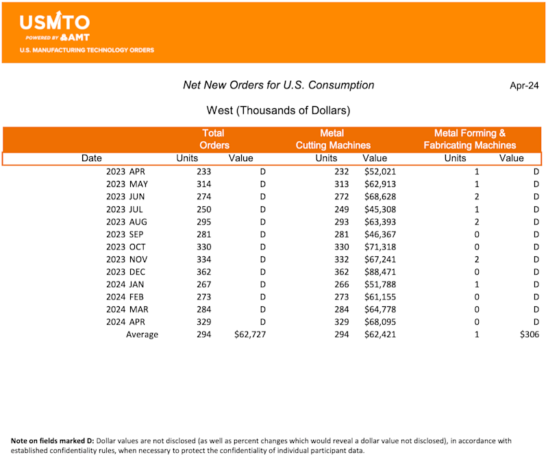 Orders of manufacturing technology, measured by the U.S. Manufacturing Technology Orders Report published by AMT – The Association For Manufacturing Technology, reached $317.9 million in April 2024. This is a 25.6% decrease from March 2024 but only 5.4% behind orders in April 2023. Orders in 2024 totaled $1.43 billion through April, 16.2% behind orders placed in the first four months of 2023.