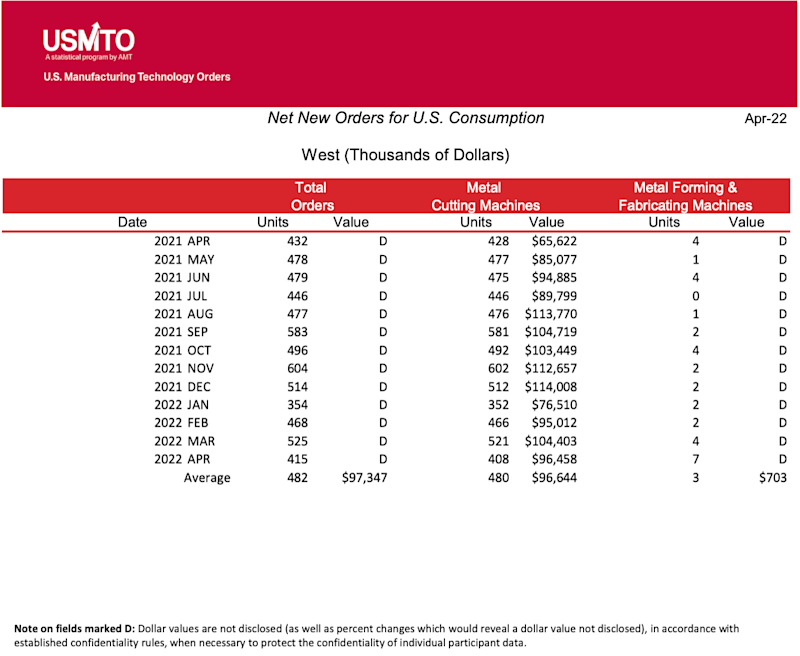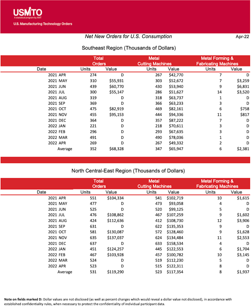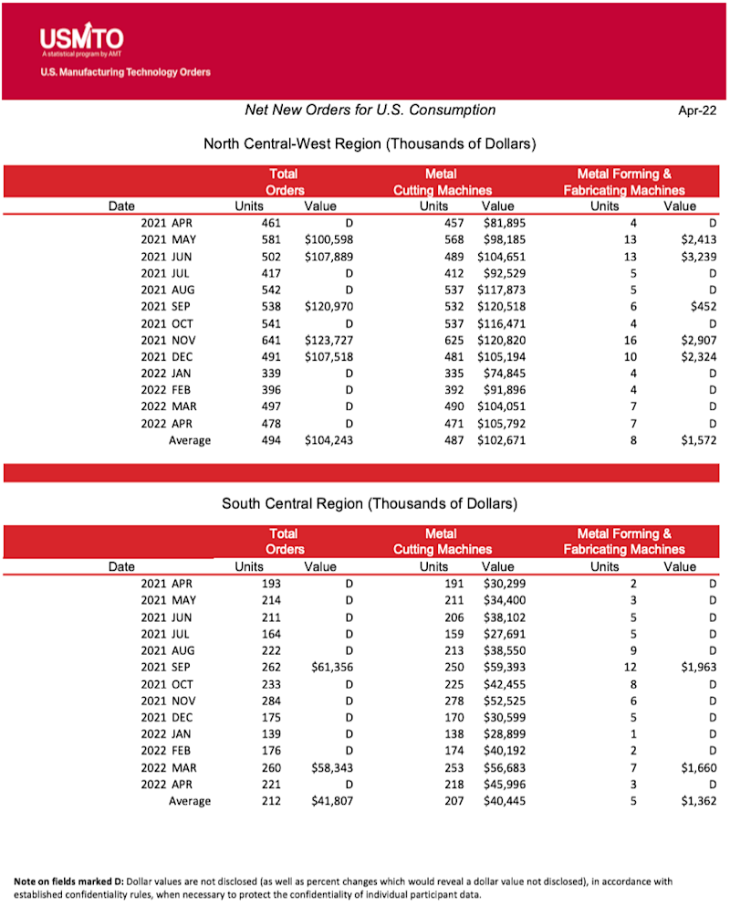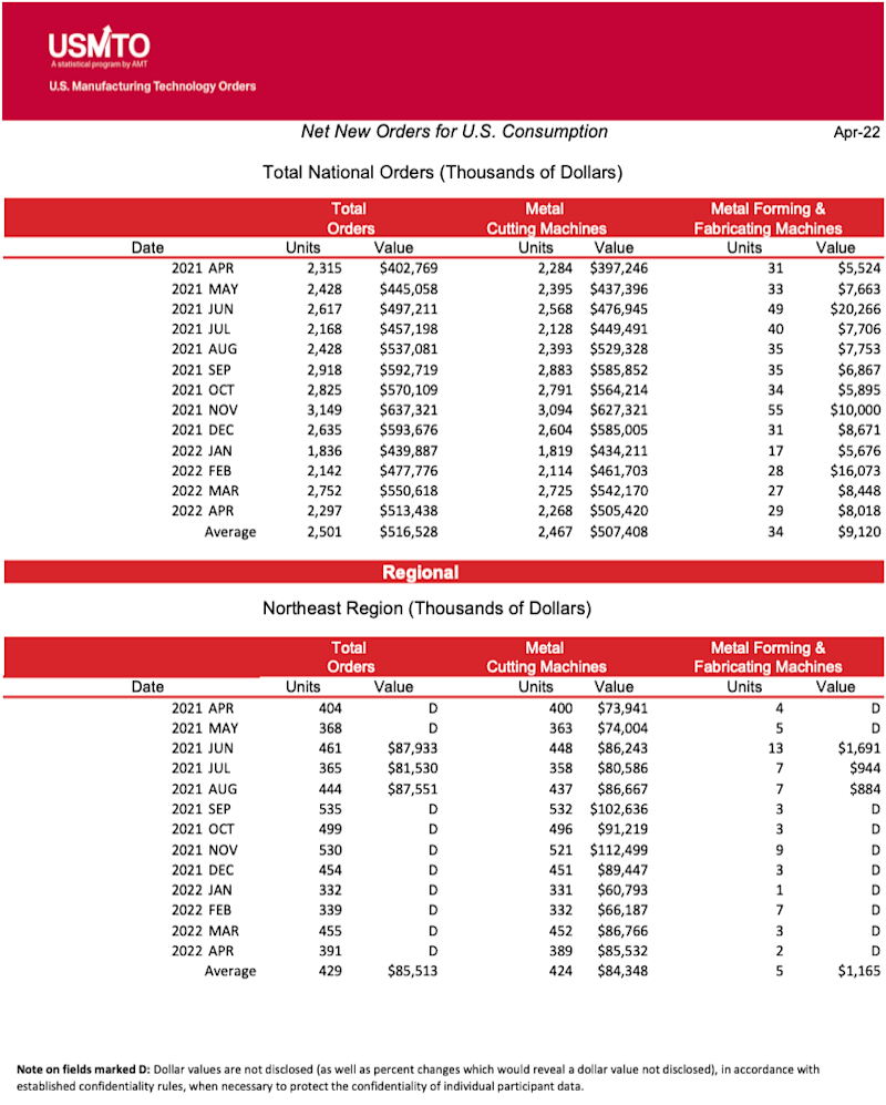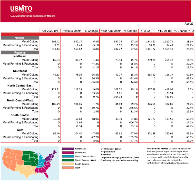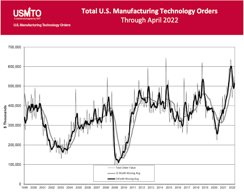 April 2022 orders of manufacturing technology totaled $513.4 million, the second month in a row surpassing half a billion dollars, according to the latest U.S. Manufacturing Technology Orders Report published by AMT – The Association For Manufacturing Technology. April orders decreased nearly 7% from March 2022 but were 27.5% larger than April 2021. 2022 orders through April totaled $1.9 billion, a 27% increase over the first four months of 2021.