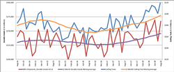 The graph below includes the 12-month moving average for the Durable Goods shipments and Cutting Tool orders. These values are calculated by taking the average of the most recent 12 months and plotting them over time.