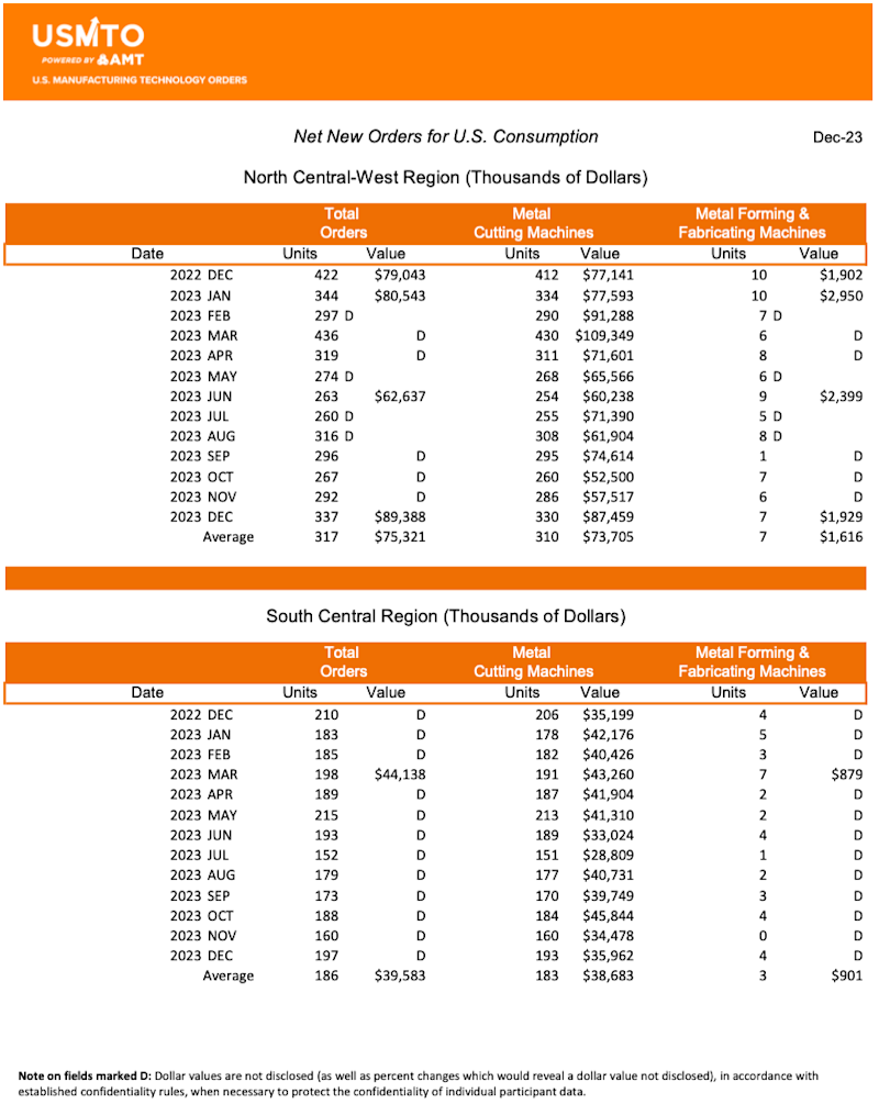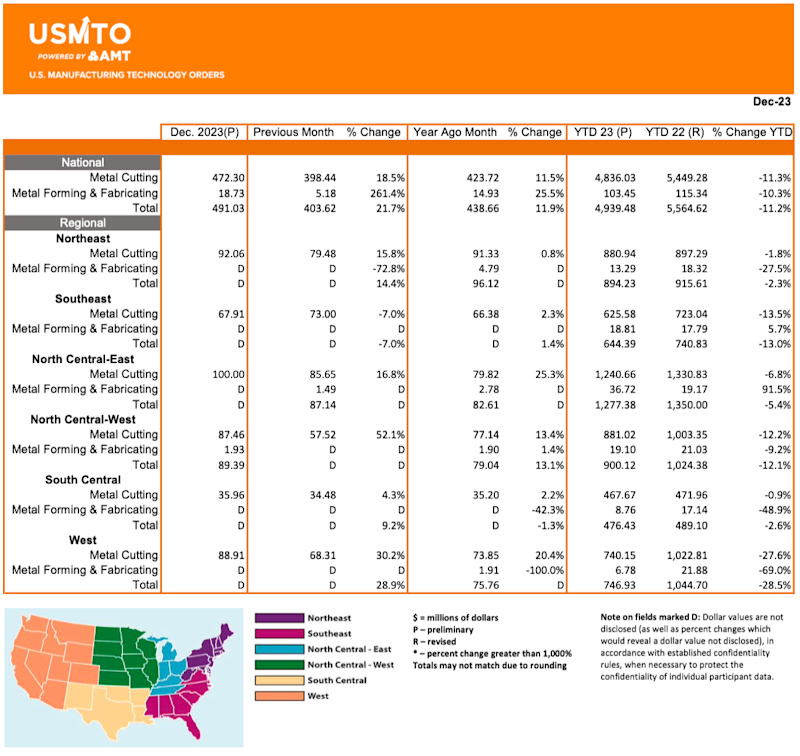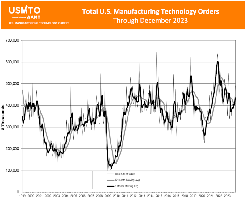 In an upside surprise, December 2023 orders of manufacturing technology totaled $491 million, up nearly 22% from November 2023, and nearly 12% above December 2022, according to the U.S. Manufacturing Technology Orders Report published by AMT.