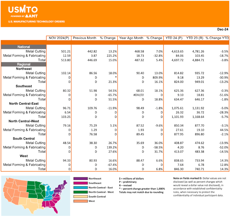 Orders of manufacturing technology, measured by the USMTO report published by AMT, totaled $513.8 million in December 2024, the highest level since March 2023. This showed an increase of 15% from November 2024 and was 5.4% behind December 2023.