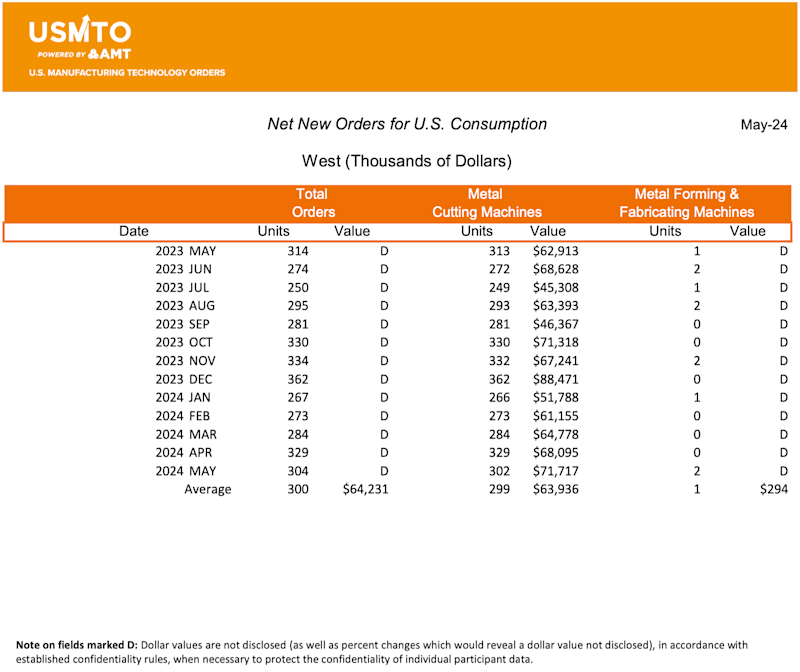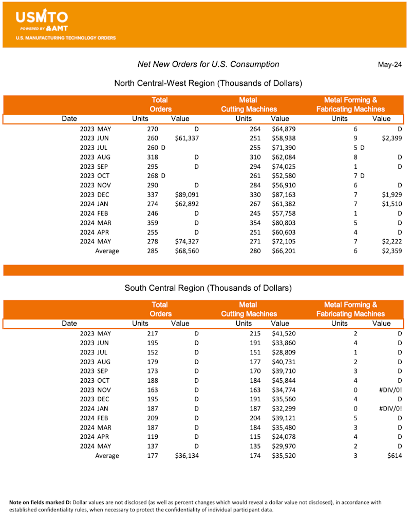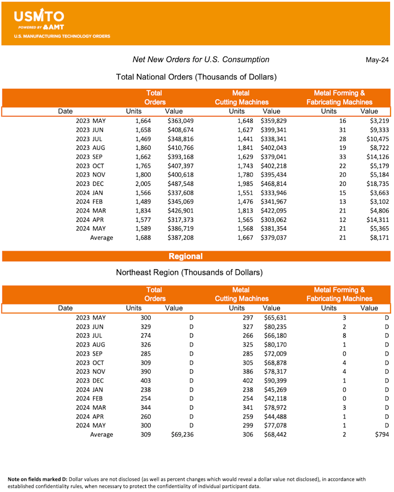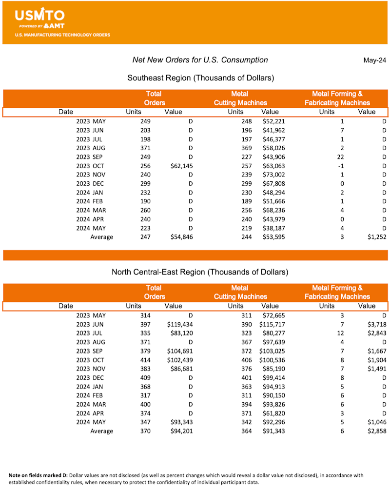 Manufacturing technology orders, measured by the U.S. Manufacturing Technology Orders Report published by AMT – The Association For Manufacturing Technology, totaled $386.7 million in May 2024. New machinery orders were up nearly 22% from April 2024 and 6.5% over May 2023. This is the first month in 2024 where the value of orders placed exceeded those of the same month the previous year. Through the first five months of 2024, orders totaled $1.8 billion, a 12.2% decrease compared to 2023.