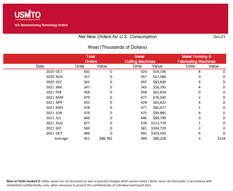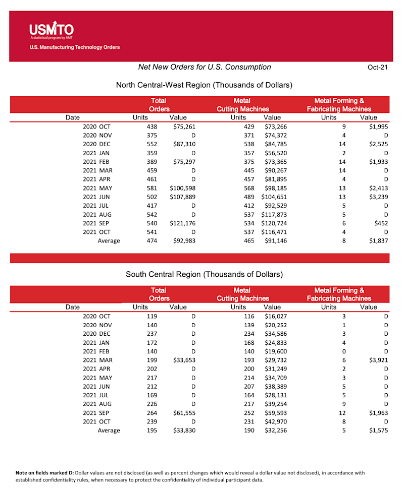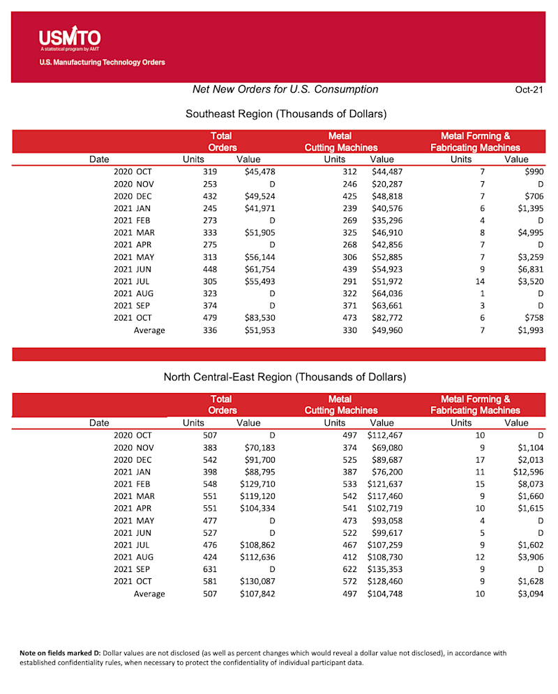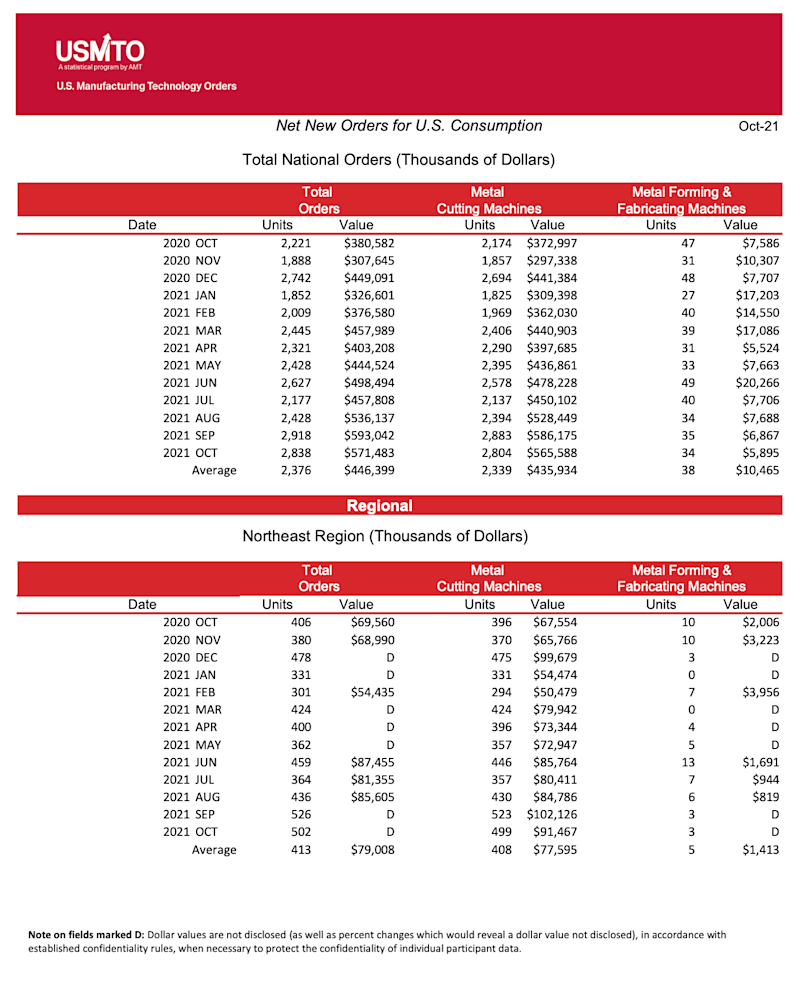 New orders of manufacturing technology totaled $571.5 million in October 2021, according to the latest U.S. Manufacturing Technology Orders Report published by AMT – The Association For Manufacturing Technology. October orders declined 3.6% from September 2021 but increased by 50.2% over October 2020. Total orders in 2021 nearly reached $4.7 billion, a 53% increase over 2020. The three consecutive months ending in October totaled $1.7 billion, the largest three-month total since April 1998.