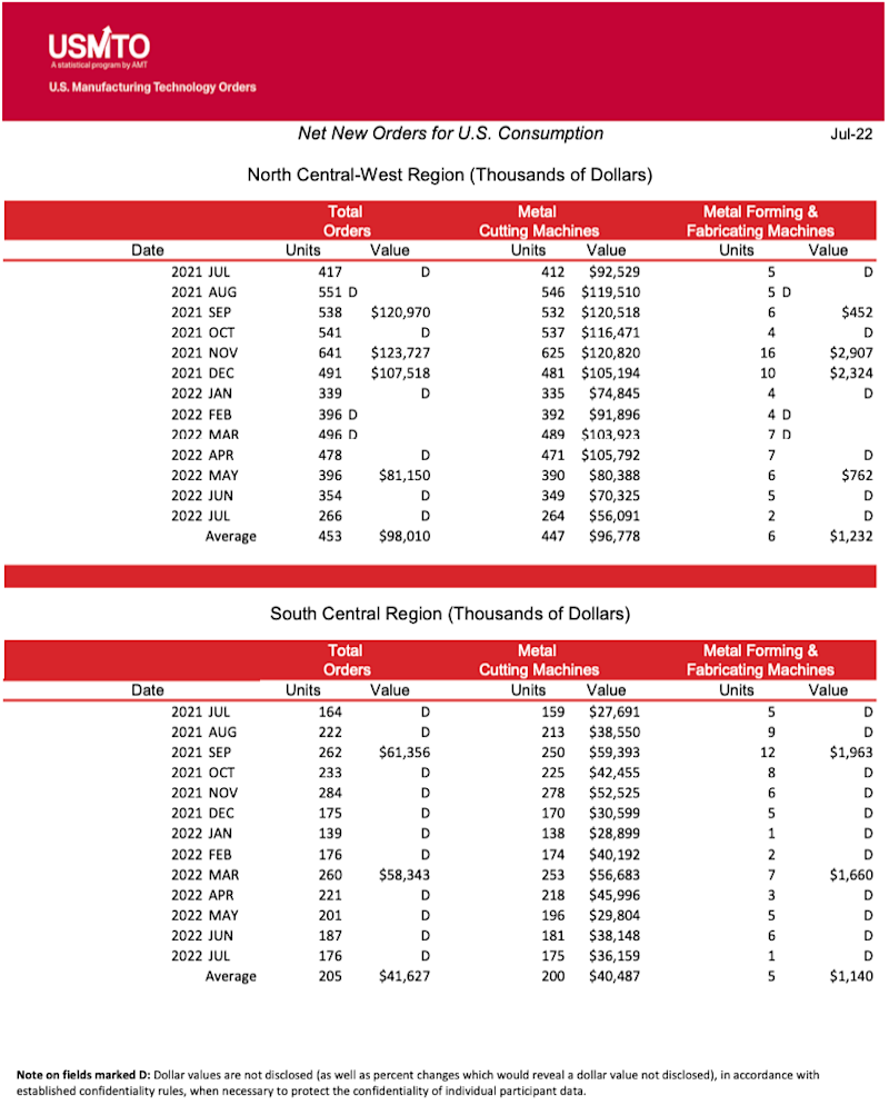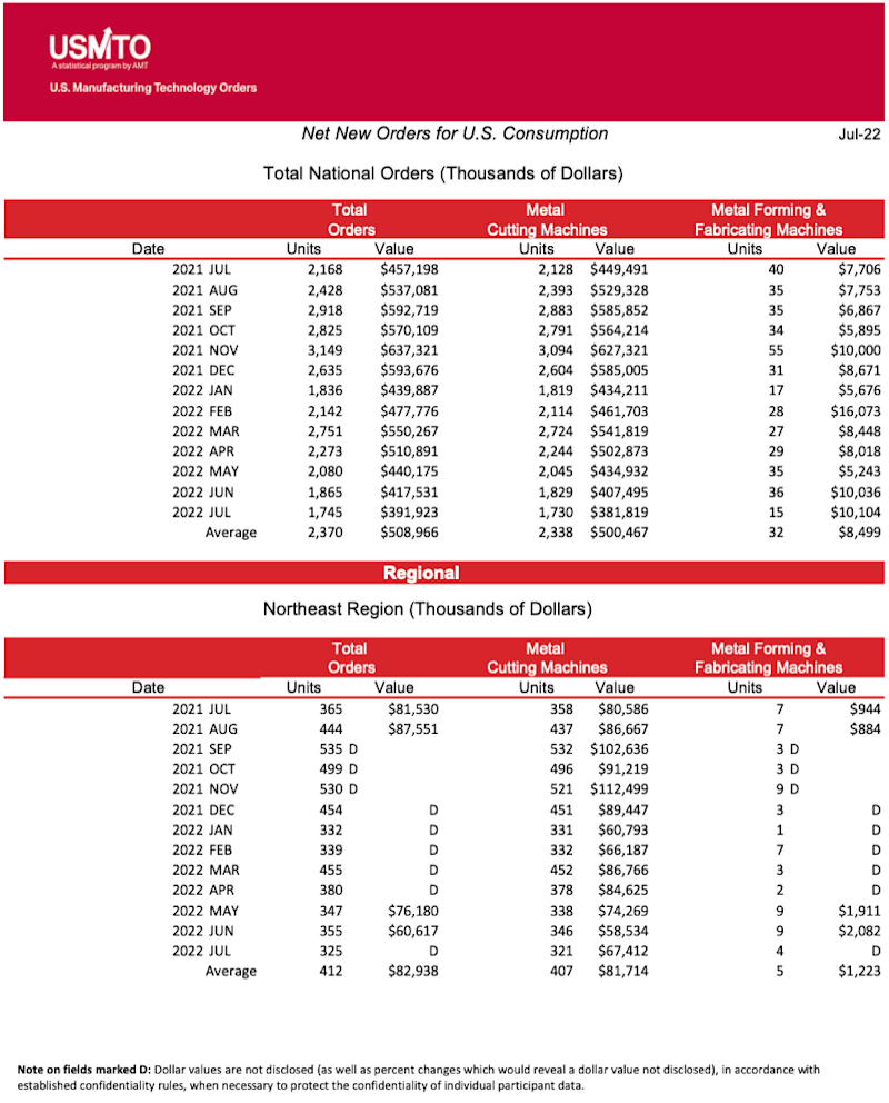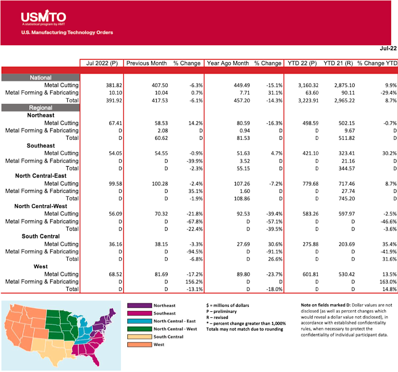 New orders of manufacturing technology totaled $291.9 million in July 2022, according to the latest U.S. Manufacturing Technology Orders report published by AMT – The Association For Manufacturing Technology