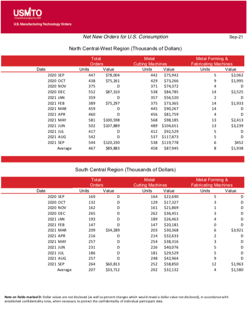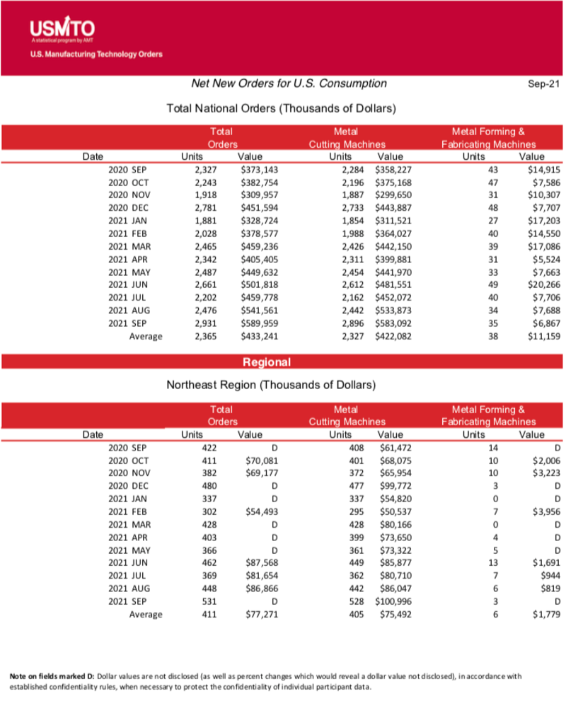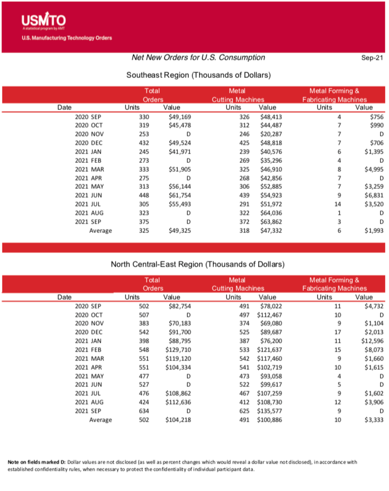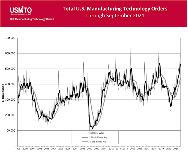 “It took 31 months after the bottom of the 2008-2009 financial crisis to have a single month with half a billion dollars in orders, but September is the third month of 2021 exceeding that mark,” said Douglas K. Woods, president of AMT. “Economists project the United States is past peak growth, yet machine orders remain at a record pace to meet remaining consumer and producer demands.”
