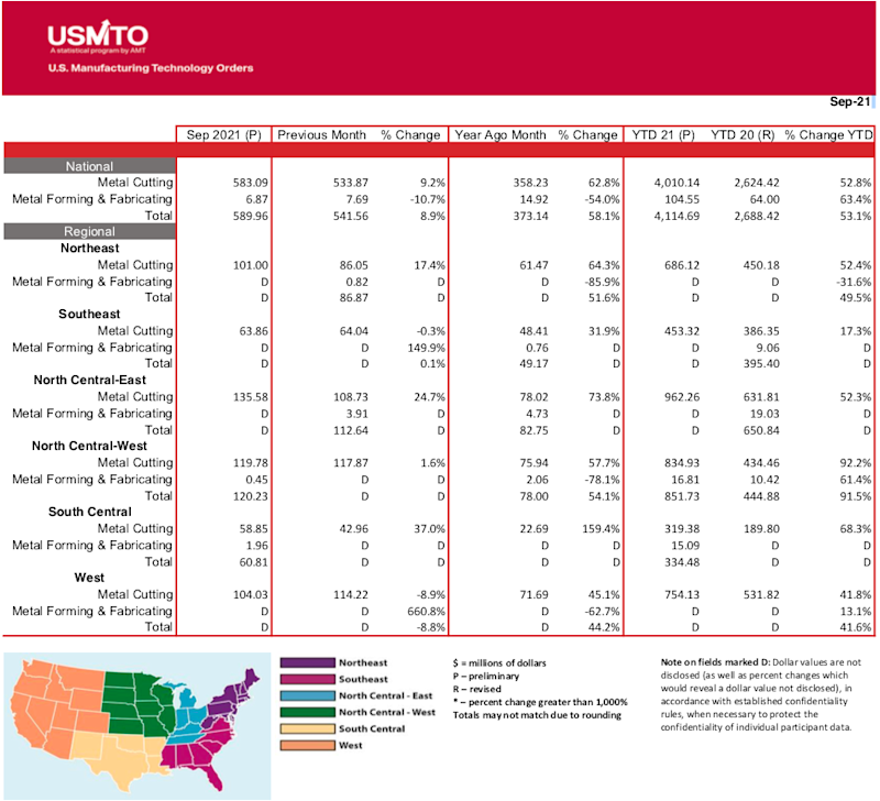 Orders of new manufacturing technology totaled $590 million in September 2021, according to the latest U.S. Manufacturing Technology Orders Report published by AMT – The Association For Manufacturing Technology. This was a 9% increase over August 2021 orders and nearly a 60% increase over September 2020. Year-to-date orders in 2021 totaled $4.115 billion, a 53% increase over the total through the first nine months of 2020.
