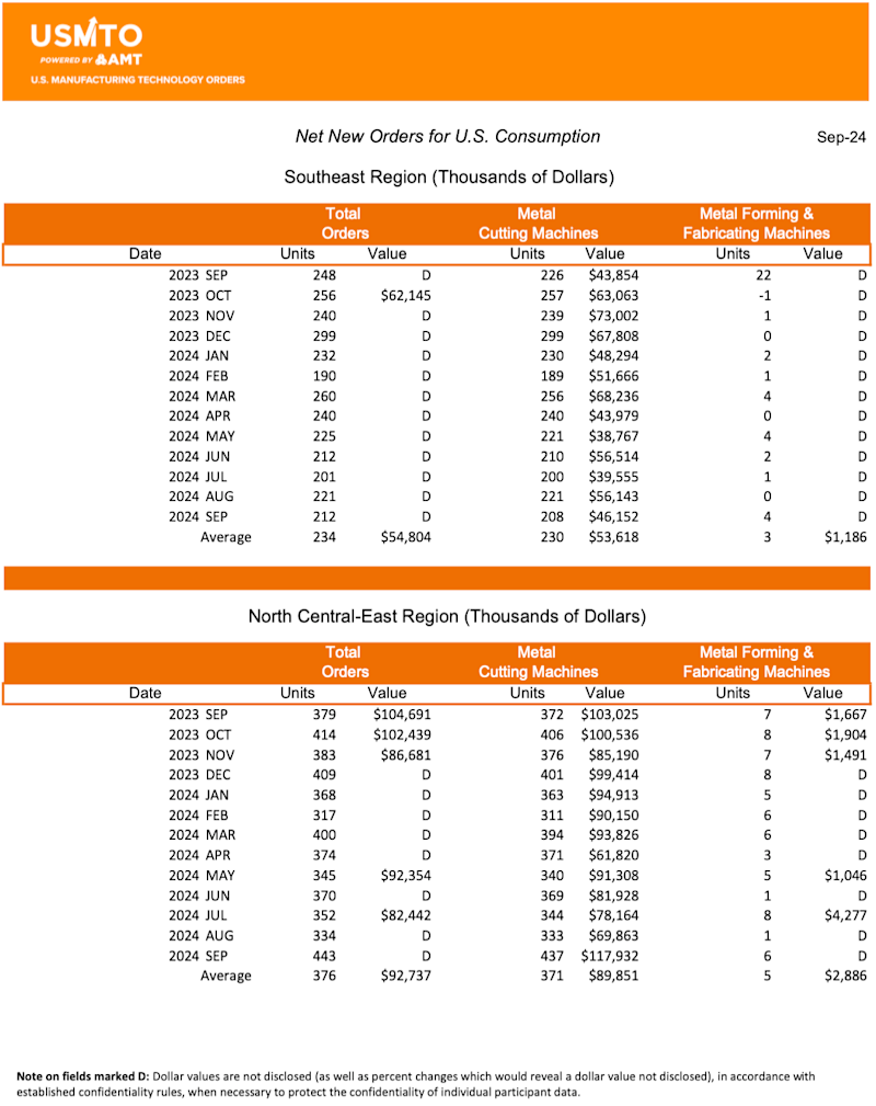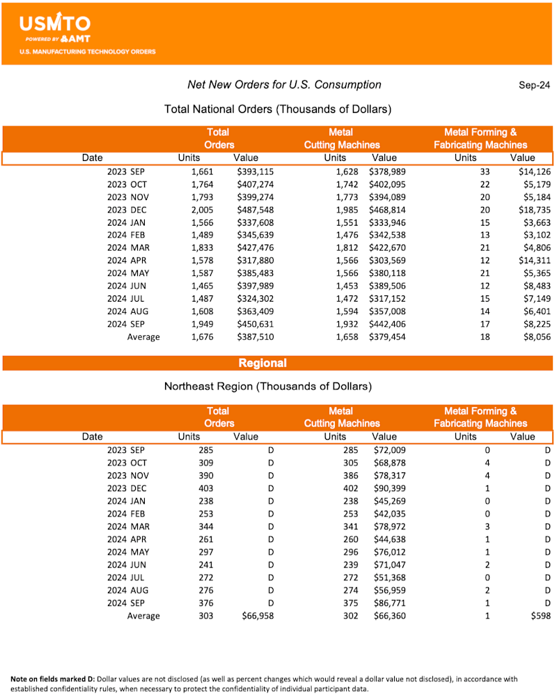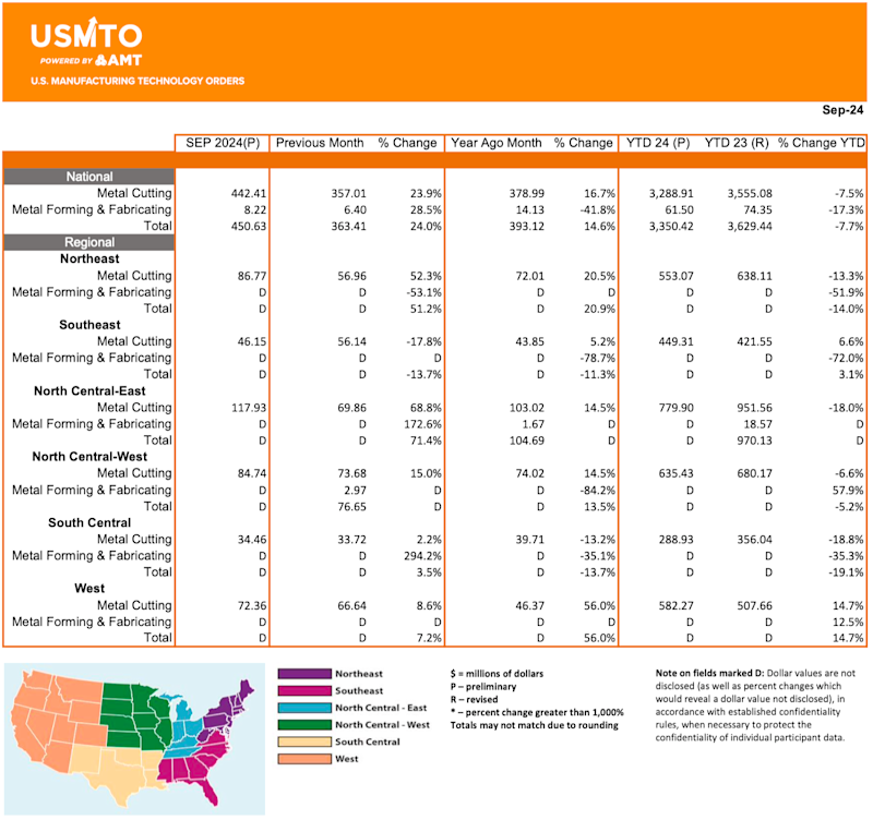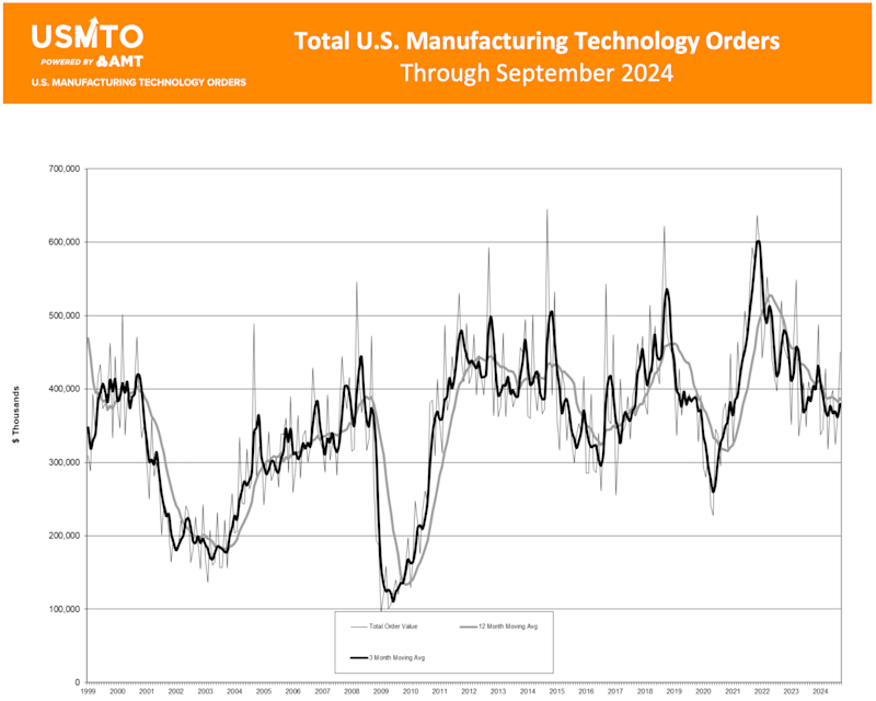 Orders of manufacturing technology, measured by the U.S. Manufacturing Technology Orders (USMTO) report published by AMT – The Association For Manufacturing Technology, totaled $450.6 million in September 2024. These orders for metalworking machinery increased 24% from August 2024 and increased 14.6% over September 2023 orders. Year-to-date orders reached $3.35 billion, a decline of 7.7% compared to the first three quarters of 2023.
