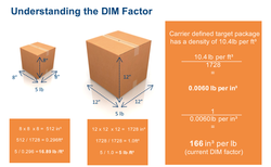 Shipment costs are traditionally assigned based on the actual weight of a package, as it reads on a scale. Carriers will now determine shipping costs according to the dimensional (DIM) weight, or the theoretical weight of a package based on its volume and a carrier-determined optimal density. The current optimal density for U.S. carriers is about 10.4 cubic feet, or 0.0060 pounds per cubic inch, which makes the current DIM factor 166 cubic inches per pound.