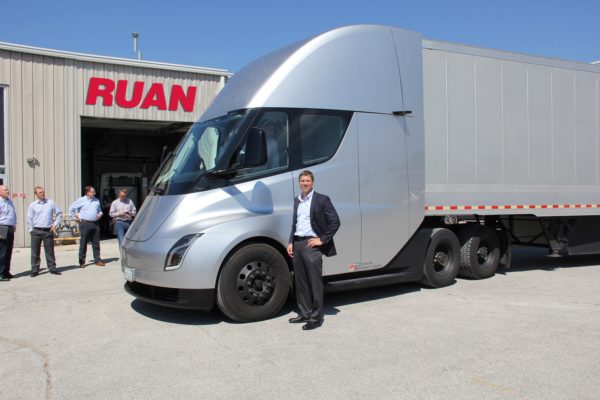 This week, representatives from Tesla Motors visited with Ruan team members and several customers for a viewing of the new, wholly electrically powered tractor-trailer. Ruan has reserved five of the trucks. The new semis were unveiled by Tesla’s CEO, Elon Musk, last year.