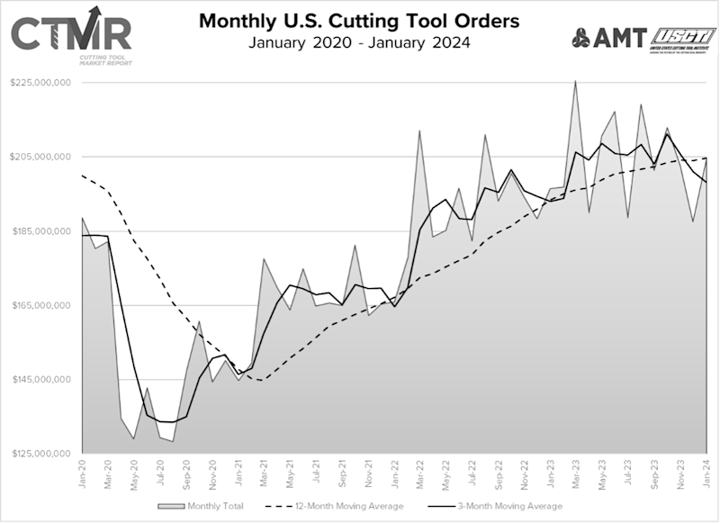 January 2024 U.S. cutting tool consumption totaled $204.5 million, according to USCTI and AMT. This total was up 9.1% from December’s $187.5 million and up 4.1% when compared with the $196.5 million reported for January 2023.