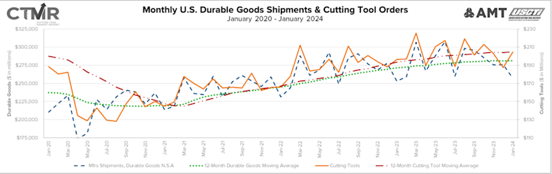 “January cutting tool shipments are a good start to 2024 and indicate that the expected decline will not be as severe as some fourth-quarter predictions that were based on the contraction in durable goods spending,” asserted Jack Burley, chairman of AMT’s Cutting Tool Product Group. “Job shops are reporting business activity, and quoting has slowed down some; however, large original equipment manufacturers in automotive, truck, and aerospace are still investing in new production lines. Overall, there is optimism within the industry for continued growth this year.”