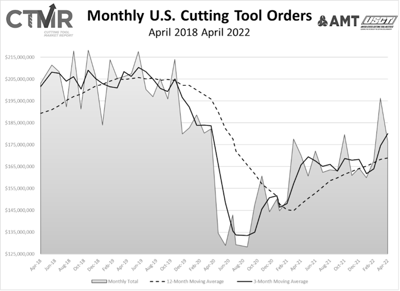 April 2022 U.S. cutting tool consumption totaled $175.5 million, according to the U.S. Cutting Tool Institute (USCTI) and AMT – The Association For Manufacturing Technology. This total, as reported by companies participating in the Cutting Tool Market Report collaboration, was down 10.1% from March’s $196.4 million and up 3.8% when compared with the $170 million reported for April 2021. With a year-to-date total of $700.4 million, 2022 is up 9.1% when compared to the same time period in 2021.