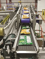 Multi-Conveyor has just built this 2:1 mild steel constructed conveyor system that merges over 100 products per minute from two lines into a single line, doubling the product/minute production rate, to feed an automated case packing machine. Individual baggers deposit on both lines at predetermined speeds providing minimum gaps between product in order to complete the vertical merge. The bags detected on the top conveyor are “injected” into the gaps on the bottom conveyor with assistance of vacuum metered belting prior to the merge. The system is controlled by a Rockwell L71 processor that communicates with Rockwell K6500 servo controllers over Ethernet using CIP motion. The Rockwell Automation 842E-CM Ethernet/IP CIP encoder provides feedback on the CIP network to gear the servo axes to the bottom conveyor for both speed and position control. The entire system actually consists of six (6) conveyor sections, including incline mat style belts, plastic belt curves, a grip top belt and three belt servo merge systems that feed into an existing case packer (not shown).