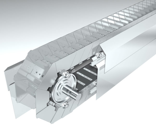 The entire belt lies with its surface on the drive and return pulley which avoids the unwanted polygon effects caused by the chain. The particularly smooth running of the machine also reduces noise emissions considerably. The noise is less than half as loud as conventional SZFs with chains, which is advantageous for both the employees and the environment.