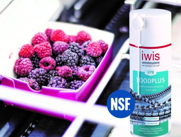 Following the proven success of its VP6 Kombi Superplus Spray for industrial chain applications, drive systems supplier iwis antriebssysteme GmbH & Co. KG has launched another innovative product: VP8 FoodPlus Spray. This re-lubricant for chains in food industry applications combines outstanding wear protection characteristics with a wide operating temperature range and corresponding certification for a variety of applications in the food industry. Tests have also confirmed that it is the best H1 chain spray on the market.