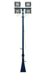 This light mast includes four of our wet area suitable LED fixtures that produce a combined total of approximately 48,000 lumens at only 600 watts. Each fixture produces 12,000 lumens of high intensity light while drawing only 150 watts @ 1.25 amps from a 120 volt electrical system. The lights are wired to a junction box at the base of the tower, and 10’ of SOOW cable terminated in an explosion proof cord cap. This tower includes an optional 5-15 straight blade plug, 5-20 twist lock plug, or a 6-20 twist lock plug. A 44” wide and 2” by 2” by ¼” thick mounting plate is attached to the upper section of the mast which provides a strong and stable platform for the four light fixtures. These light masts are typically mounted to trailers or other stable surfaces by a 15” by 13”, ¼” thick mounting baseplate which has been predrilled to accept six 9/16” anchor bolts. The light tower weighs approximately 450 pounds and can easily support and lift 150 pounds of weight.