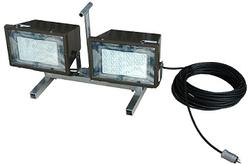 This Pedestal Mounted Hazardous Location Light is designed to provide operators with a quickly deployed source of illumination that has all the safety and performance of dedicated permanent mount units. With lamp housings constructed of powder coated non sparking aluminum, 100 feet of SOOW abrasive and oil resistant cord, and a wet area approval rating, this unit is built to stand up to the demanding conditions of the industrial workplace. The LED lamps mounted to this unit are rated at 150 watts each and produce a total of 29,580 lumens. The lamp housings are constructed of aluminum with a durable powder coat finish, have hinged tempered glass doors, and allow operation with voltages ranging from 120VAC to 277VAC. The rugged pedestal base on this unit provides a secure platform for easy light placement and includes an integral carrying handle with ergonomic grip for easy carrying from one location in the workplace to another. Included with the light is 100 feet of abrasive and oil resistant SOOW explosion proof cord ending in an ECP 1523 5-15P Class 1 Division 1 explosion proof straight blade plug which provides ample cord length for deployment in large work areas. This pedestal mounted work light is UL rated Class 1 Division 2 Groups C and D is approved for use in wet areas and marine environments, making it an ideal lighting solution for hazardous locations where water resistance is an important requirement. This pedestal mounted lighting package is an ideal lighting solution for applications including but not limited to: loading docks, shipyards, plant turnarounds, tunnel projects, utility gas plants, and power plant areas.