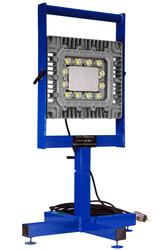 This portable fixture is comprised of a 100 watt LED light head that is mounted atop of a base stand that is fabricated from non-sparking aluminum. The lamp can be easily adjusted up or down 90° and locked into position by loosening the two hand screws located on the side of the light head. Once the light is in the desired position, the operator then tightens the screws back to set the position. The light frame assembly features a carrying handle on the top for easy transport and a hand screw at the base allowing operators to pivot the top frame assembly on the four leg base stand. Included with this portable LED light is 100 feet SOOW cord terminated in a 1523 explosion proof straight blade plug. This unit is multi-voltage capable and can be configured to operate on 120-277 volts AC.