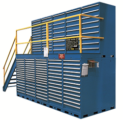 The Mini Mezzanine consists of two rows of Lista’s storage cabinets, plus stairs and railings. Stacked back to back on the first level, the cabinets are arranged with a single row on the second level using the other first level row as a balcony. The addition of a safety railing and an access staircase to one or both ends increases the amount of storage at a very reasonable price. Requiring no walkway or grating system, the modular Mini Mezzanine lets you arrange and re-arrange your mezzanine layout to meet your evolving storage and retrieval needs.