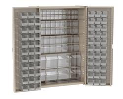 Akro-Mils introduces systems of its heavy-duty bin Cabinets and quick-view security bin cabinets equipped with TiltView™ tilting bins. Akro-Mils’ heavy-duty bin Cabinets (48″ W x 24″ D x 72″ H) feature all-welded 16-gauge steel construction with 7-gauge reinforced corners. Its heavy-duty steel handle with keyed padlock ensures complete security of contents. The cabinet’s powder-coat paint stands up to heavy-duty daily use. This new package includes 68 TiltView bins in the following sizes: (24) 3-3/4″ L x 23-5/8″ W x 4-1/2″ H, (20) 5-3/8″ L x 23-5/8″ W x 6-1/2″ H, (16) 6-3/4″ L x 23-5/8″ W x 8-3/16″ H, and (8) 12-5/16″ L x 23-5/8″ W x 14″ H. This cabinet provides for additional storage on the doors — space for up to (66) 30230 clear AkroBins® (10-7/8″ L x 4-3/8″ W x 5″ H), giving users a highly efficient use of space. Quick-View security bin cabinets (36″ W x 18″ D x 78″ H) feature all-welded 16-gauge steel construction. Lexan™ door panels allow materials to be viewed, even when the cabinet is locked. The cabinet includes a keyed handle with three-point locking system for security. The cabinet’s powder-coat paint stands up to heavy-duty daily use. This new package includes either 31 or 39 TiltView bins in various sizes, as well as an additional 24 Clear 30230 AkroBins.