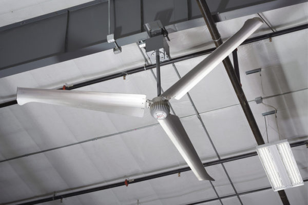A single Direct Drive HVLS fan can circulate a large volume of air up to 85 feet from the fan’s center in all directions for optimum heating or cooling of an area encompassing up to 22,000 square feet. The unique design of the fan directs air outward from the center in a conical shape, eliminating dead-air holes directly beneath the fan and in building corners – translating to more uniform airflow from floor to ceiling and from wall to wall.