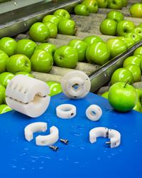 Custom thermoplastic shaft collars, couplings and flange mounts for food processing equipment and conveyors used in wet environments and requiring frequent washdown are being introduced by Stafford Manufacturing Corp. of Wilmington, Massachusetts. Stafford Plastic Shaft Mount Components are machined from Teflon®, Delrin®, nylon and other thermoplastics and supplied with stainless steel clamping screws. Developed for FDA- and USDA-approved processing equipment and conveyors, they include one- and two-piece shaft collars, set-screw collars, hinged shaft collars, one- and two-piece couplings and flange mounts. Suitable for applications requiring frequent washdown and exposure to chemicals such as food- and pharmaceutical processing, Stafford plastic shaft mount components are available in 1” to 4” I.D. bore sizes. Allowing system designers to exactly match other components, they can also be supplied in stainless steel, steel and anodized aluminum.