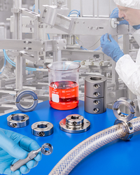Available in a wide range of sizes from 1/4” I.D. up, Stafford Stainless Steel Shaft Collars are available in one- and two-piece and hinged clamp styles with smooth bores. A Grip & Go™ handle can convert a standard shaft collar into a rapidly adjustable locating device. Accu-Flange™ Collars are offered for component mounting, and rigid couplings come in one-, two-, and three-piece styles with straight- or stepped bores.