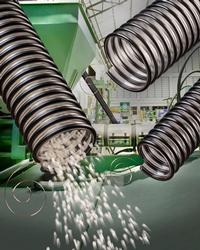 A permanently static dissipative polyurethane plastic pellet transfer hose that promotes workplace safety and withstands suction cycling when feeding plastic extruders is available from FLEXAUST of Warsaw, Indiana.
