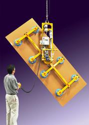 An electric powered vacuum lifter-tilter and 360 degree rotator for handling glass and architectural building panels, composite sheets, and solar panels is being introduced by Anver Corporation of Hudson, Massachusetts. The Anver ET100M8 Vacuum Lifter and Powered Tilter with Powered Rotation is ideally suited for handling 12 ft. x 6 ft. panels weighing up to 1,000 lbs. Featuring a heavy-duty electric actuator for tilting and a worm gear drive that powers the 360 degree rotation, this vacuum lifter-tilter is ideally suited for in-plant assembly, production, and packaging operations. Capable of instantly adapting to different panels, the Anver ET100M8 Vacuum Lifter and Powered Tilter with Powered Rotation has adjustable suction cups on cross arms that also adjust along a beam. Suction cups can be made from various materials including foam for textured surfaces. A remote control keeps the operator safely away from the load.